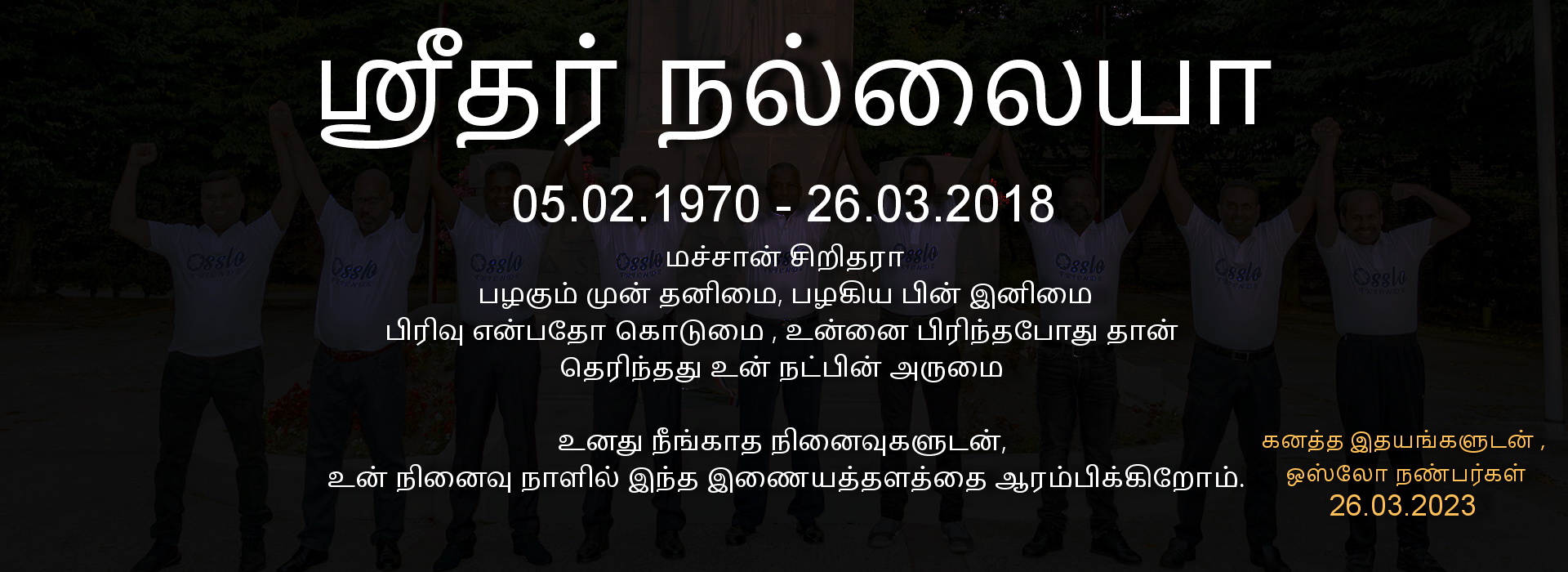 மச்சான் சிறிதரா, நிழலில் ஓய்வெடுத்து அமைதியான உறக்கத்தில் நம் அனைவருக்கும் காத்திருக்கிறாய் நீ. நாம் ஒவ்வொருவராக மீண்டும் சந்திக்கும் போது உடைந்த எம் சங்கிலியை கடவுள் இணைப்பார் அதுவரைக்கும் காத்திரு. - ஒஸ்லோ நண்பர்கள்